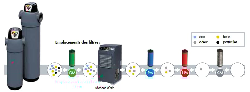 Phase 2: conditionner l’air compriméL’air comprimé contient beaucoup de condensation humide et des particules microscopiques, qui par le biais de purgeurs de condensation, filtres et sécheurs d’air comprimé peut être purifié pour qu’on puisse l’utiliser dans de bonnes conditions pour par exemple le pistolage en peinture ou d’autres applications